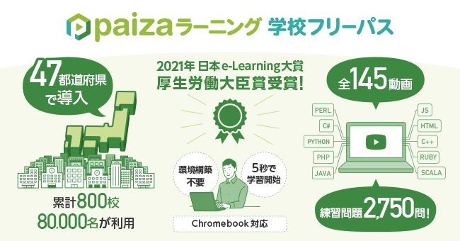 「paizaラーニング 学校フリーパス」を47都道府県の約800校、8万人が導入。高校のプログラミング教育必修化、大学入試導入などを背景に右肩上がりで増加