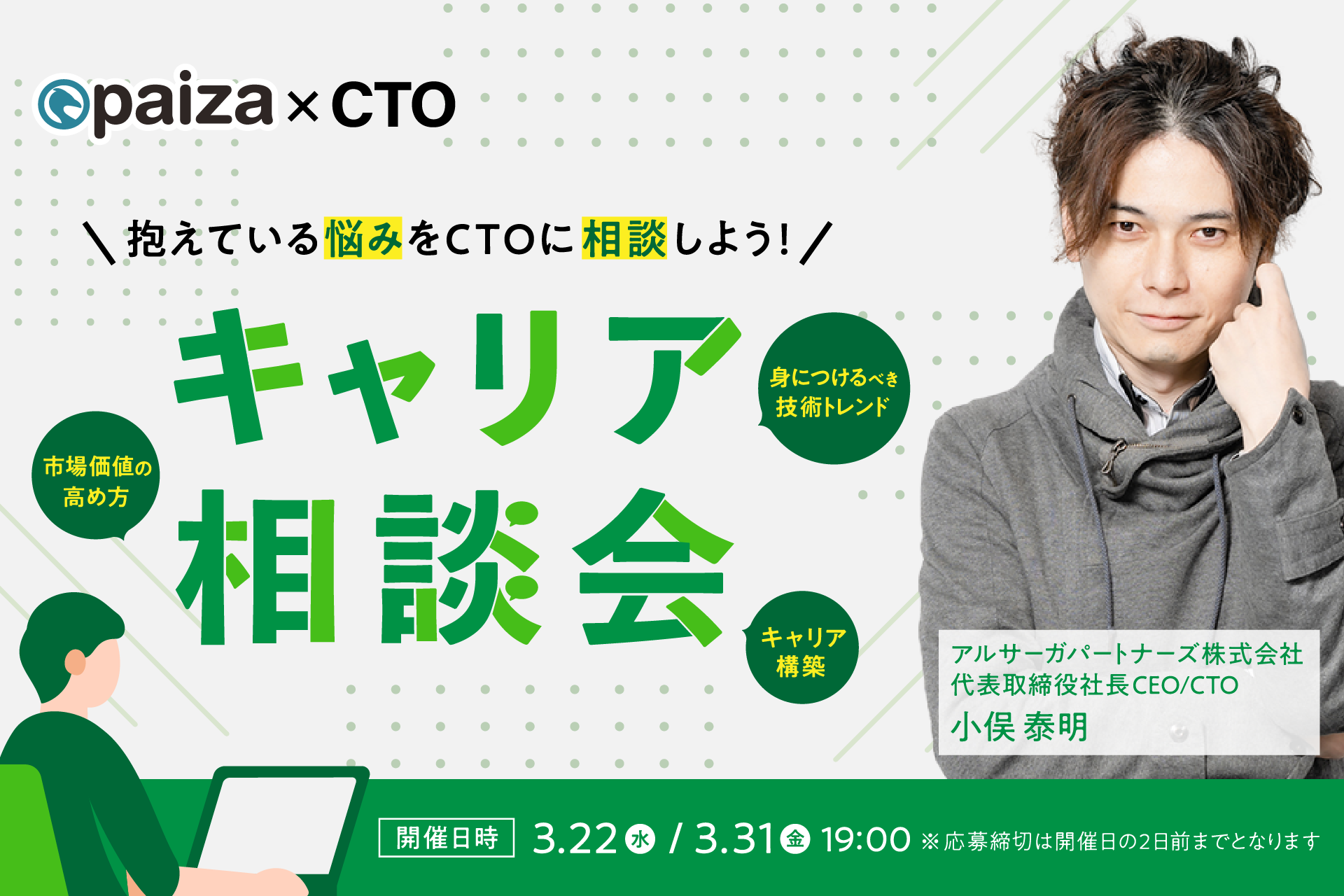 ITエンジニア向け国内最大の転職・就職・学習プラットフォーム「paiza(パイザ)」は、このたび、アルサーガパートナーズ株式会社の代表取締役社長CEO/CTO 小俣泰明氏による未経験、新人ITエンジニア向け「paiza×CTO キャリア相談会」を2023年3月22日(水)、31日(金) に実施します。2023年3月9日(木)より応募の受付を開始します。