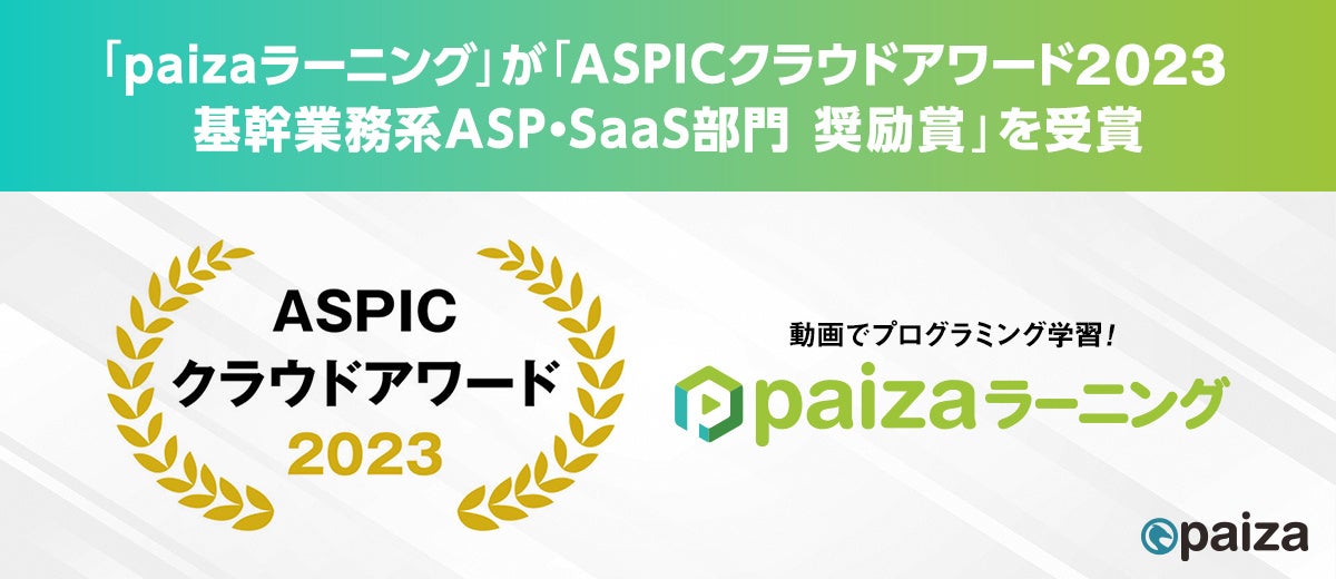 ITエンジニア向け国内最大の転職・就職・学習プラットフォーム「paiza(パイザ)」を運営するpaiza株式会社は、就職・転職直結型の動画プログラミング学習サービス「paizaラーニング」が「ASPICクラウドアワード2023」(主催:一般社団法人日本クラウド産業協会(略称:ASPIC、東京都品川区西五反田、会長:河合 輝欣))において、活躍が期待される優れたサービスとして「基幹業務系ASP・SaaS部門 奨励賞」を受賞しましたことをお知らせいたします。