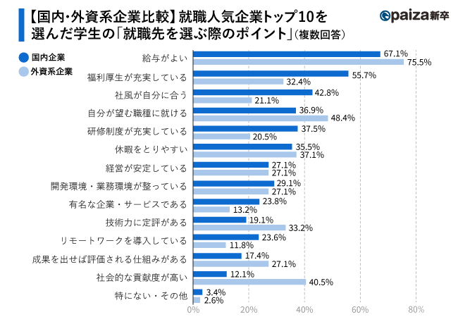 ※「人気トップ10企業」にランクインした企業を対象に、学生が就職先を選ぶ際のポイントを国内企業、外資系企業別に集計して比較
