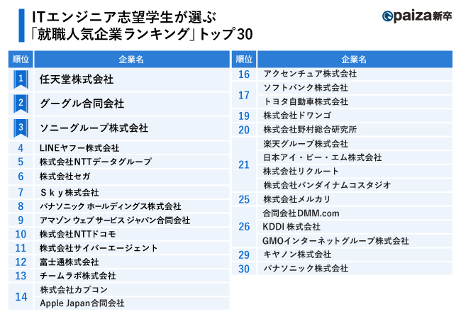 ITエンジニア向け国内最大の転職・就職・学習プラットフォーム「paiza(パイザ)」を運営するpaiza株式会社は、ITエンジニア職専門の就職情報サービス「paiza新卒」(URL:https://paiza.jp/student)登録者でITエンジニアを志望する学生を対象にアンケートを実施し、ITエンジニア志望学生が選ぶ「就職人気企業ランキング」を発表いたします。