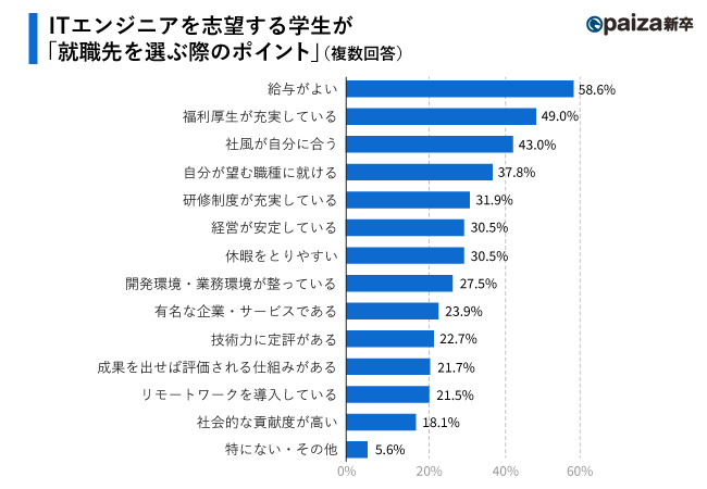 今回は、「paiza新卒」に登録するITエンジニア志望学生に就職を希望する企業とその理由を調査しました。結果を見ると、「給与」「福利厚生」などの待遇面や「経営の安定性」、「有名かどうか」など企業としての安心感を重視する学生の姿が浮き彫りとなりました。