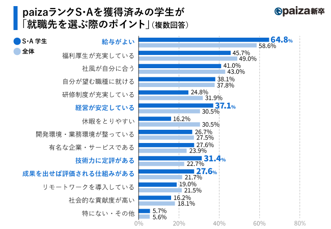 全学生が企業選択の際に重視する項目とpaizaランクS・Aの学生が重視するポイントには以下のような違いがありました。