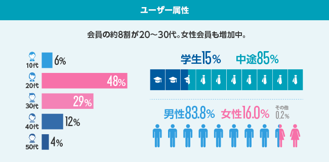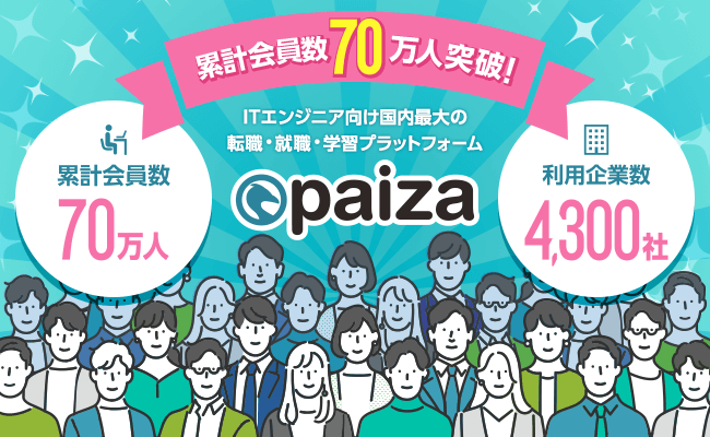 paizaは、2013年のサービス開始以来、ITエンジニアをはじめとする多くのIT人材、IT人材を目指す学生の方々にご支持いただき累計会員数70万人、利用企業数4,300社を突破するサービスに成長しました。直近1年間で約10万人会員数が増加しています。