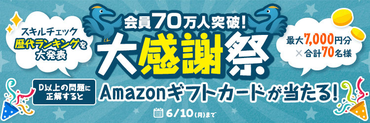 このたび累計会員数70万人突破を記念して、「会員70万人突破!大感謝祭」と題した「paizaスキルチェック」受験キャンペーンを実施します。ぜひこの機会にpaizaに登録し、スキルアップを目指してください。