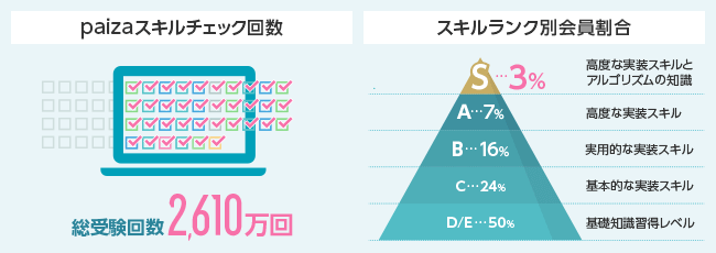 Java、PHP、Rubyなど15の言語の中から自由に選択し、実際にコードを書いて解答することでユーザーのスキルを6段階で評価する「paizaスキルチェック」。総受験回数は2,600万回を超え、これは一人当たり「37回」以上受験している計算になります。
