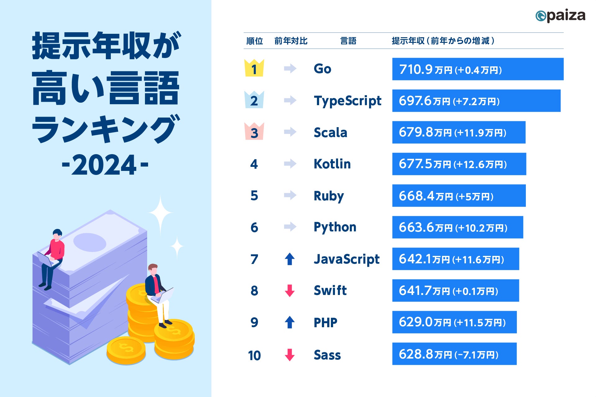 2024年の提示年収が高い言語ランキングでは、Go、TypeScript、Scalaがトップ3となりました。