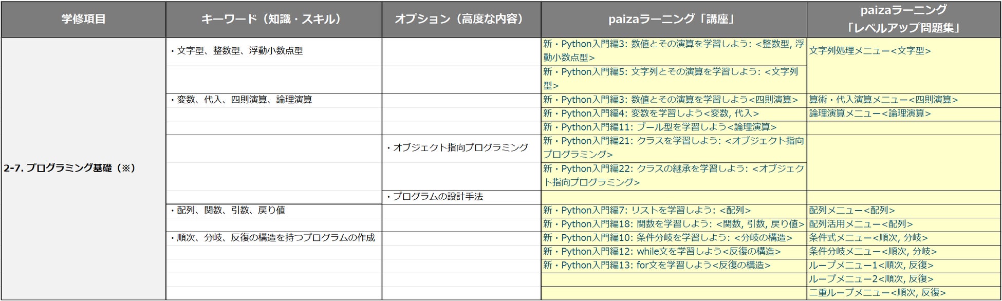モデルカリキュラムとpaizaラーニングの「講座」と「レベルアップ問題集」対応表(応用基礎レベルの一部抜粋)