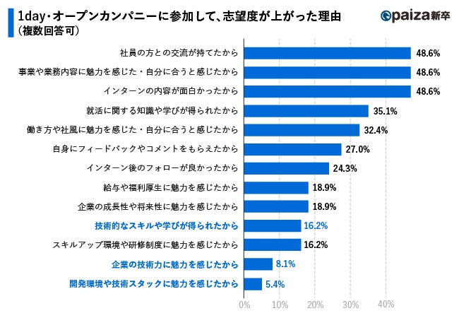 また、インターン参加後に志望度が上がった理由として、就業・プロジェクト型/1day・オープンカンパニー型に共通して開発経験や開発環境、技術面で魅力を感じて志望度が上がっている学生がいるのがITエンジニア志望学生ならではの特徴と考えられます。