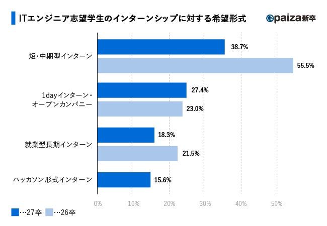 気軽に参加できる1day型は人気ではありますが、26卒27卒ともに複数日以上の期間で開催されるインターンシップへの支持も一定数あることや今回「ハッカソン形式インターン」と回答したユーザーが約14%いることから、ITエンジニア志望学生は就業後の開発現場を体験できるインターンを求めているのではないかと推察いたします。