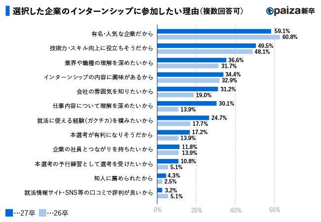 また、26卒と27卒の回答結果を比較すると27卒ITエンジニア志望学生は「会社の雰囲気を知りたいから」、「仕事内容について理解を深めたいから」、「就活に使える経験(ガクチカ)を積みたいから」が大きく増えています。