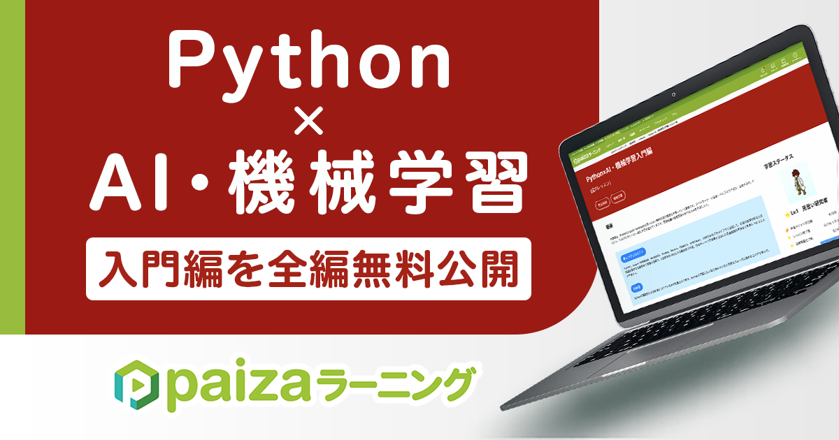 ITエンジニア向け転職・就職・学習プラットフォーム「paiza(パイザ)」を運営するpaiza株式会社は、当社のプログラミング学習サービス「paizaラーニング」において、「Python×AI・機械学習入門編」講座の全編無料公開を開始いたしました。