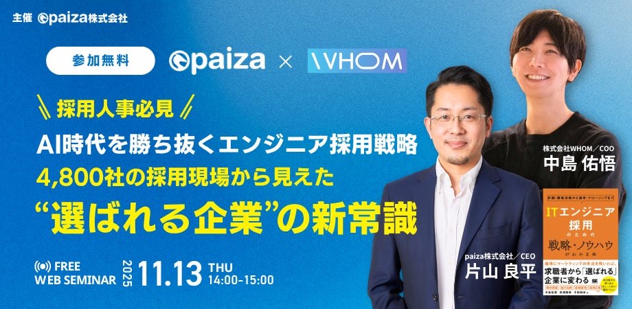 ITエンジニア向け転職・就職・学習プラットフォーム「paiza(パイザ)」を運営するpaiza株式会社(東京都港区、代表取締役社長/CEO 片山良平)は、株式会社WHOM 取締役COO 中島 佑悟 氏をお招きし、【採用人事必見】AI時代を勝ち抜くエンジニア採用戦略ウェビナーを開催いたします。